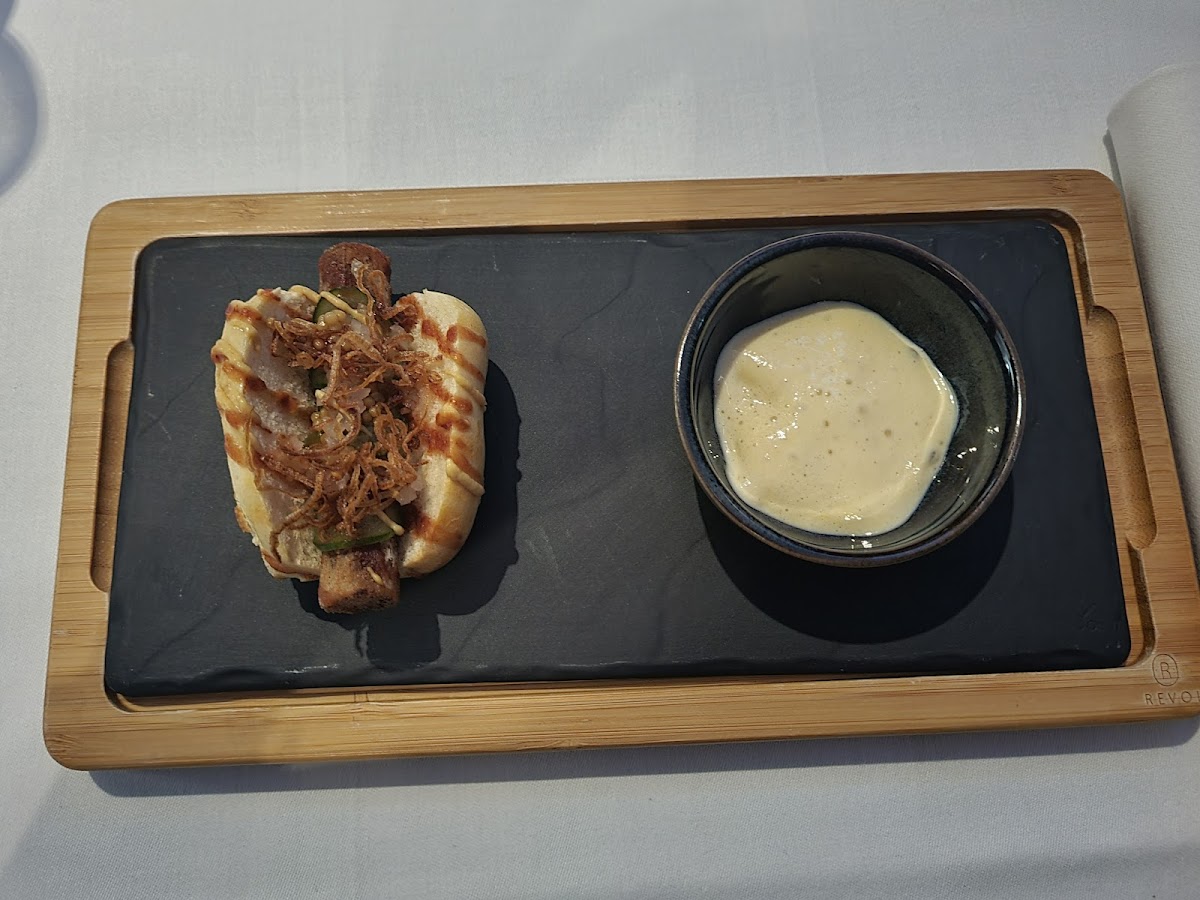 The restaurant stands out for its eclectic and flavorful menu, featuring dishes that cater to a variety of tastes. One highlight is the Veganer Schwarzwurzel-hot Dog, a plant-based delight that offers an unexpected twist on a classic favorite. The dish is carefully crafted with Schwarzwurzel, also known as black salsify, giving it a rich, earthy flavor that’s complemented perfectly by the savory toppings. Whether you're vegan or just looking for something different, this dish is a must-try.